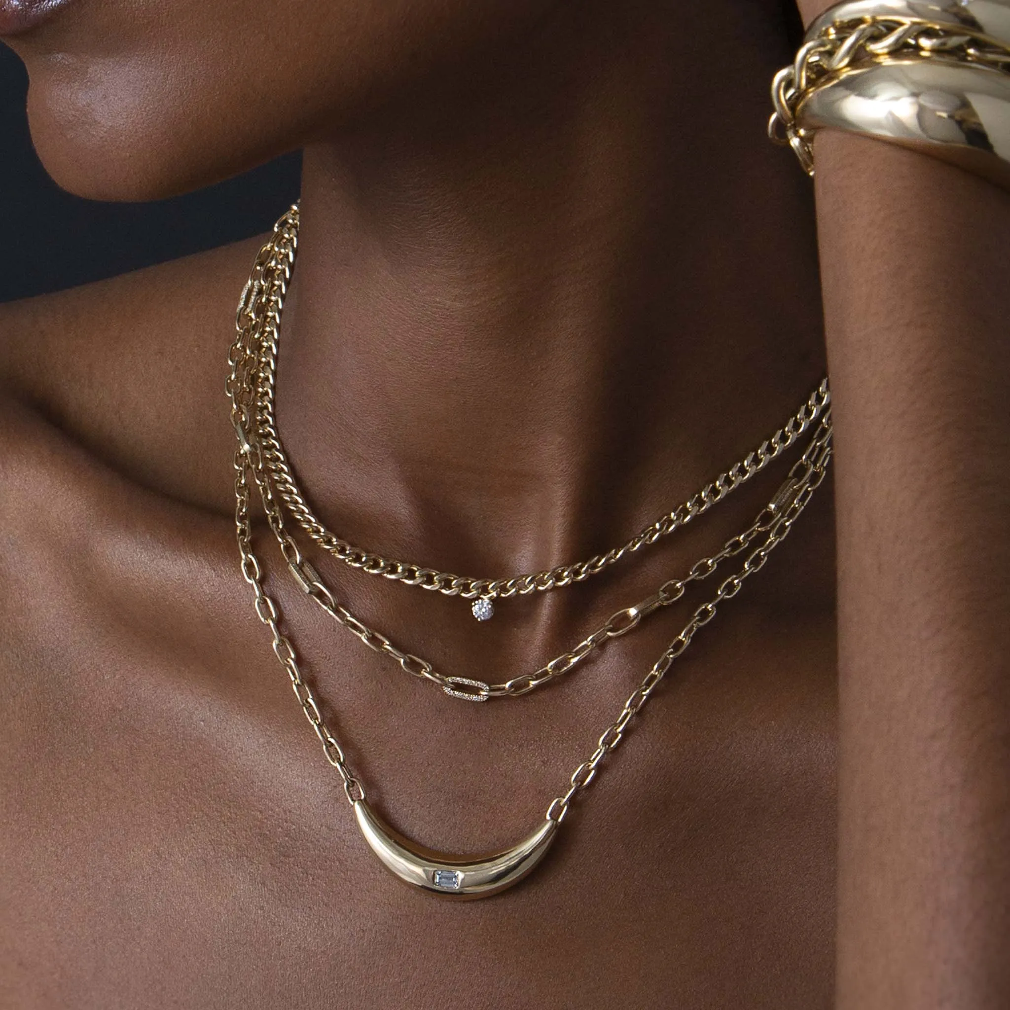 14k gold medium hollow curb chain necklace with a large prong set round diamond set below the chain