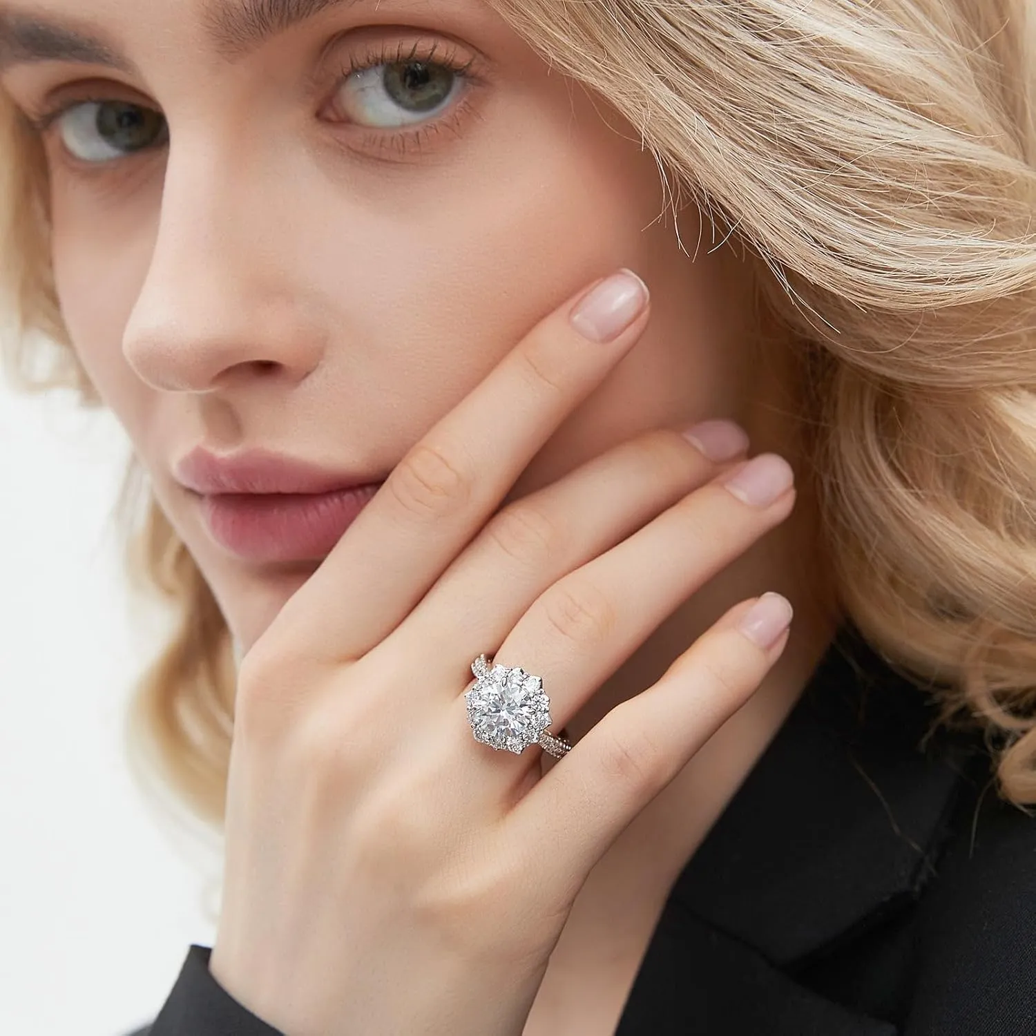 - 2 CT Big Flower Shaped Moissanite Engagement Ring Our Elio Passero moissanite engagement ring for women crafted with a 2 CT big Moissanite in the center and 12 pieces stones around,they combined like a beautiful flower,shining like stars around the moon.The arm is decorated with a lot of small cz, giving people a very luxurious feeling.