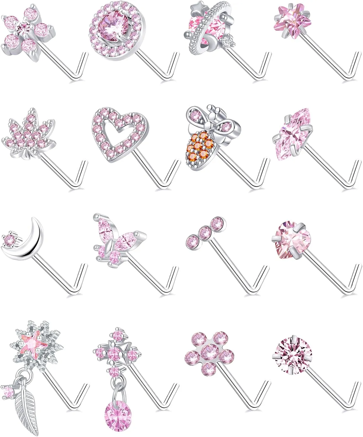 - Nose Rings Studs SetYou will Get 16Pcs Different L Shaped Nose Studs, Including Star, Round CZ, Planet, Maple Leaf,Dangle, Bee, Opal, Moon, Heart, Butterfly, 3 CZ Dots, Flower Dangle etc, Cute and Unique Nose Ring L Shaped, to Meet with Various Acquirement of Daily Life