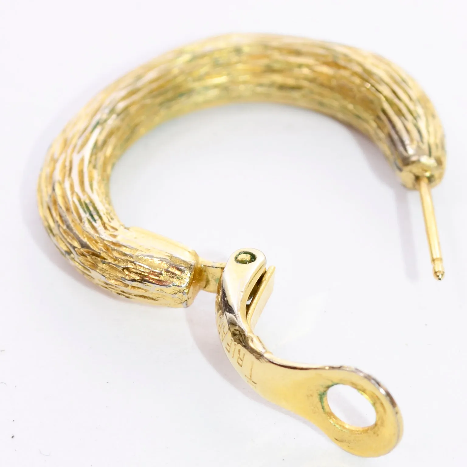 These are timeless vintage Trifari pierced hoop earrings in a textured gold. These earrings are very unique with their textured gold finish and the polished front flat section that make them stand out from ordinary hoop earrings. These lovely earrings measure 3/4 inches from top to bottom. Trifari crown logo.