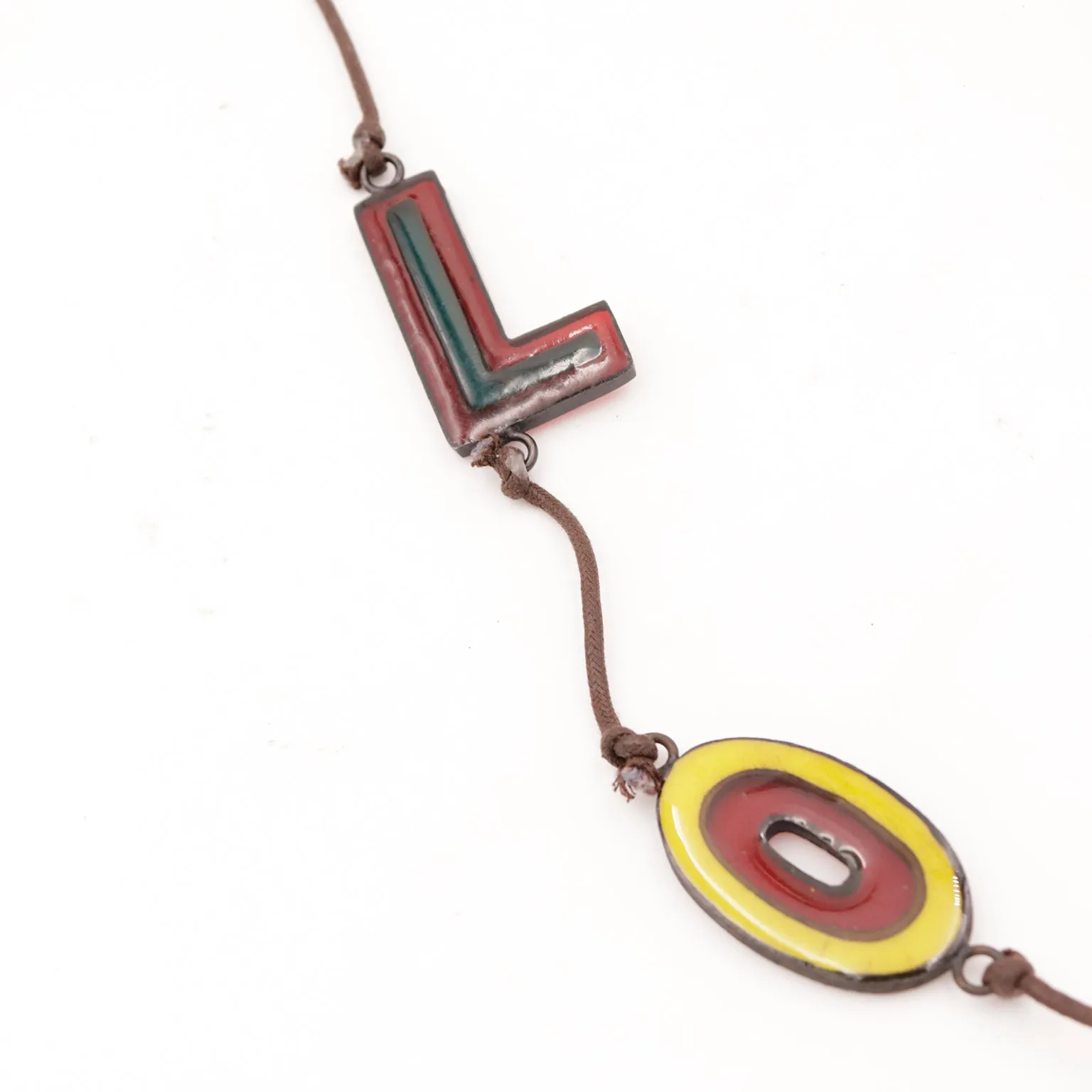 Franco Moschino was passionate about using his favorite things in his designs. Butterflies, hearts, lucky tokens, Olive Oyl, exclamation marks, cows, and all things Italy are just a few of the icons we see repeated in Moschino pieces. This fun necklace is deadstock and still has its original Moschino tag attached. The letters on the necklace spell out the word love in a type of plastic that imitates stained glass or Venetian glass. The letters are on leather that can be adjusted to fit a variety of lengths. This necklace was originally $280 in the 1990's, which would be the equivalent of around $500 today.