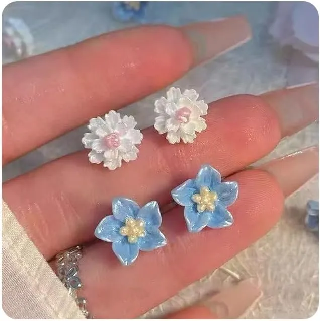 - DUAL DESIGN SET: Features two pairs of delicate floral stud earrings - white carnations with pink centers and blue camellia with yellow centers