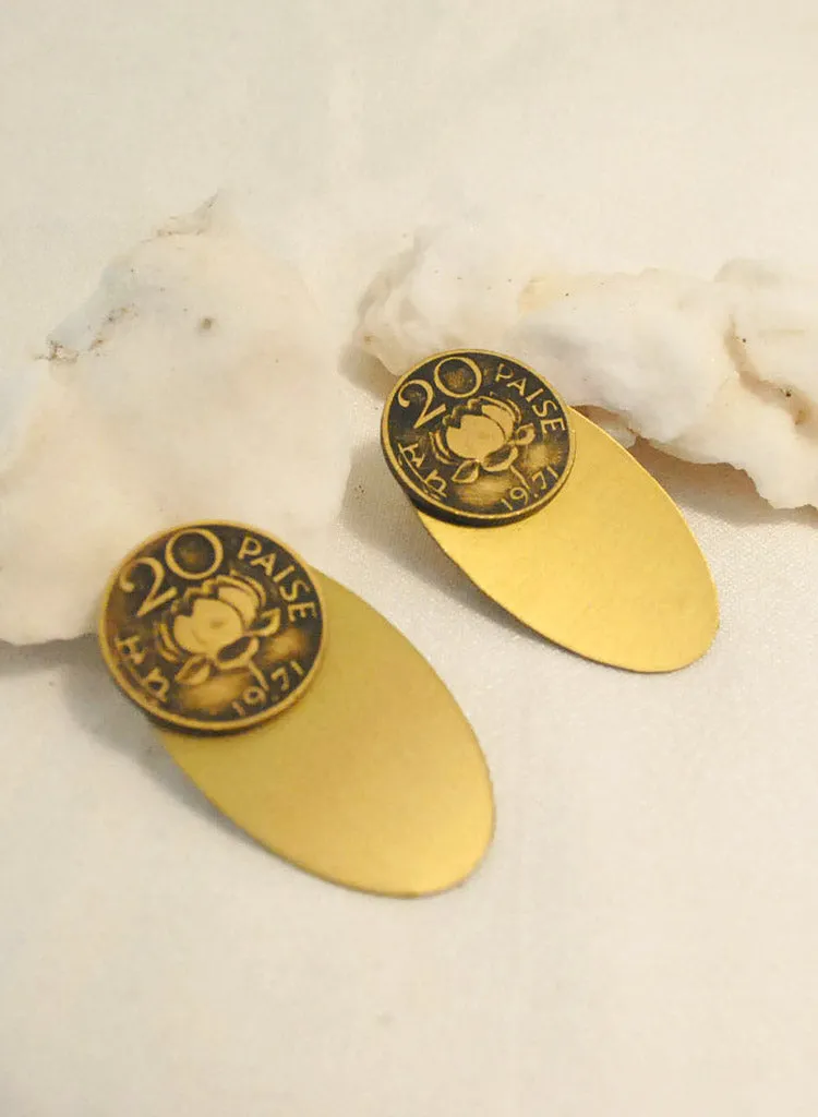 A pair of 'Paise' stud earrings with oxidised brass drop earjacket. Size 5cm x 2.5cm.