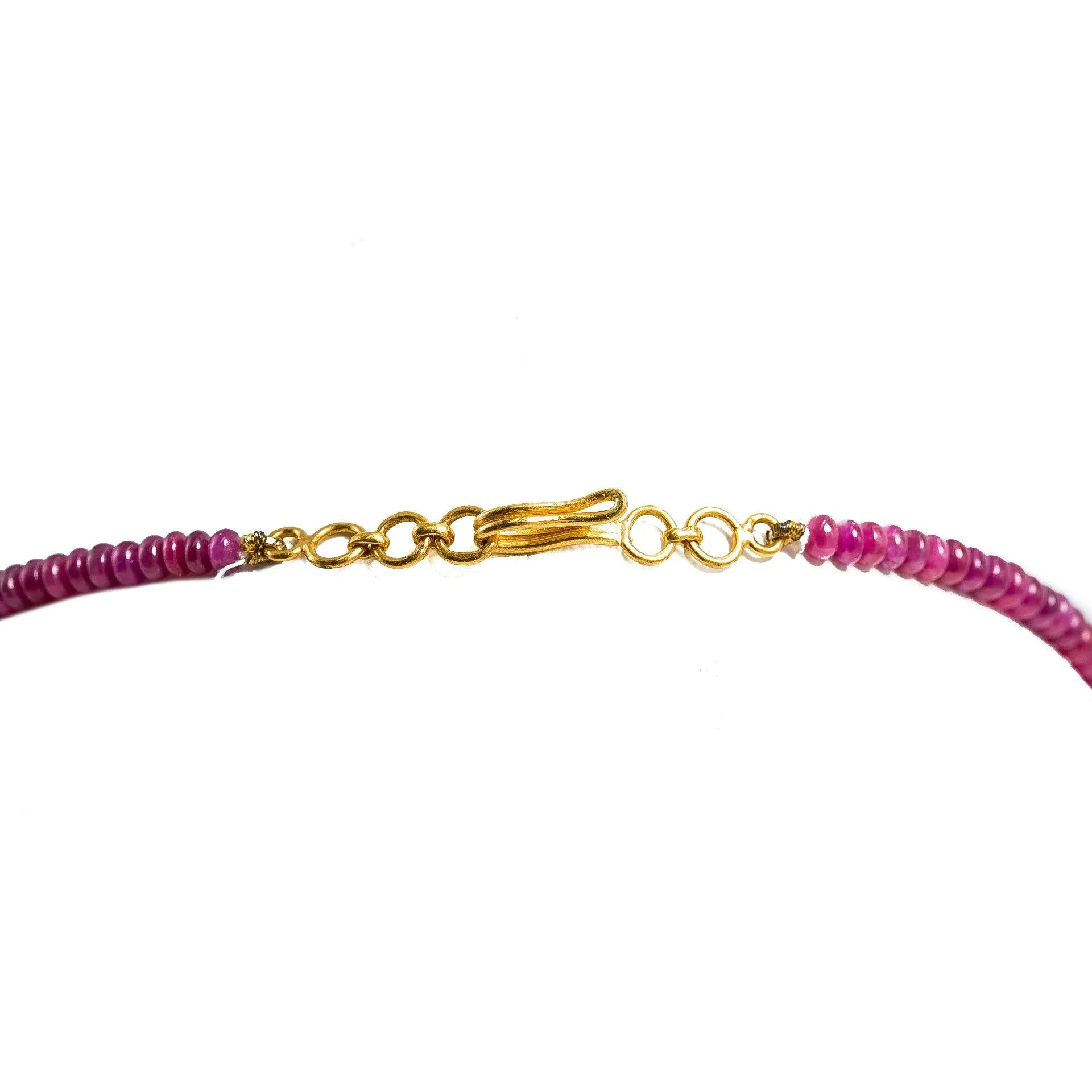 22K Yellow Gold Necklace & Earrings Set W/ Rubies, Black Sapphires & Emeralds for women. Brighten up your attire with this beautiful 22K yellow gold necklace and earrings set with a colorful design of precious rubies, black sapphires and emeralds seamlessly strung together. The necklace is 18 inches long with a width range of 2-10 mm wide. Its ornate pendant is 46 mm long and 22 mm wide. Each drop earring is 22 mm long and 10.5 mm wide. This decadent set has a total gold weight of 34.3 grams.