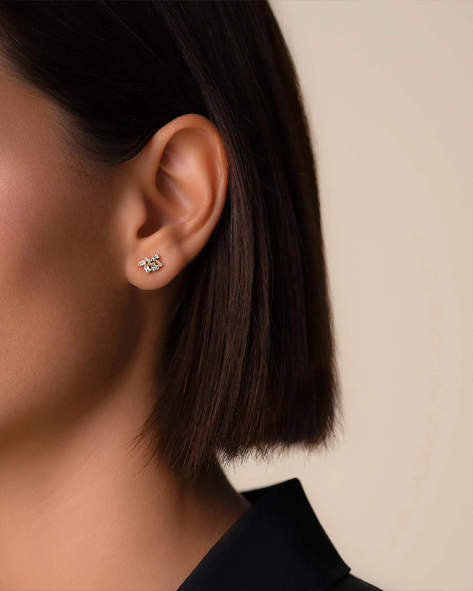 Crafted in 18-karat gold, these studs feature shining white diamond baguettes set in a scattered pattern to create a bursting effect. Timeless in design and perfect for daily wear, these studs are a staple for any collection.