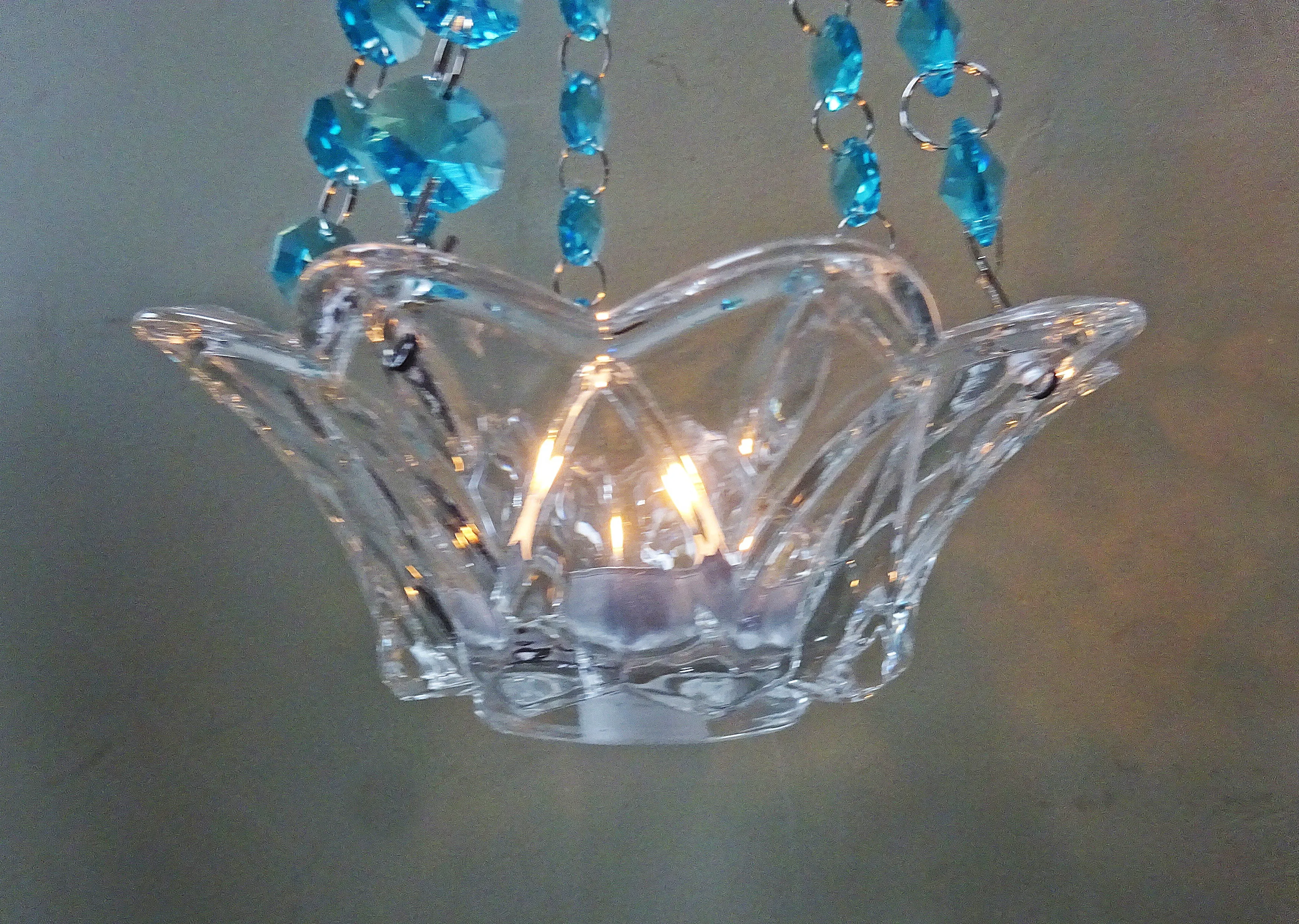 2 - 5 chains of cut glass crystals in aqua teal. Each chain measures approximately 20cm / 8". The glass beads are linked with chrome rings with a further ring at the end of the chain and form the hanging chains to suspend the dish.
