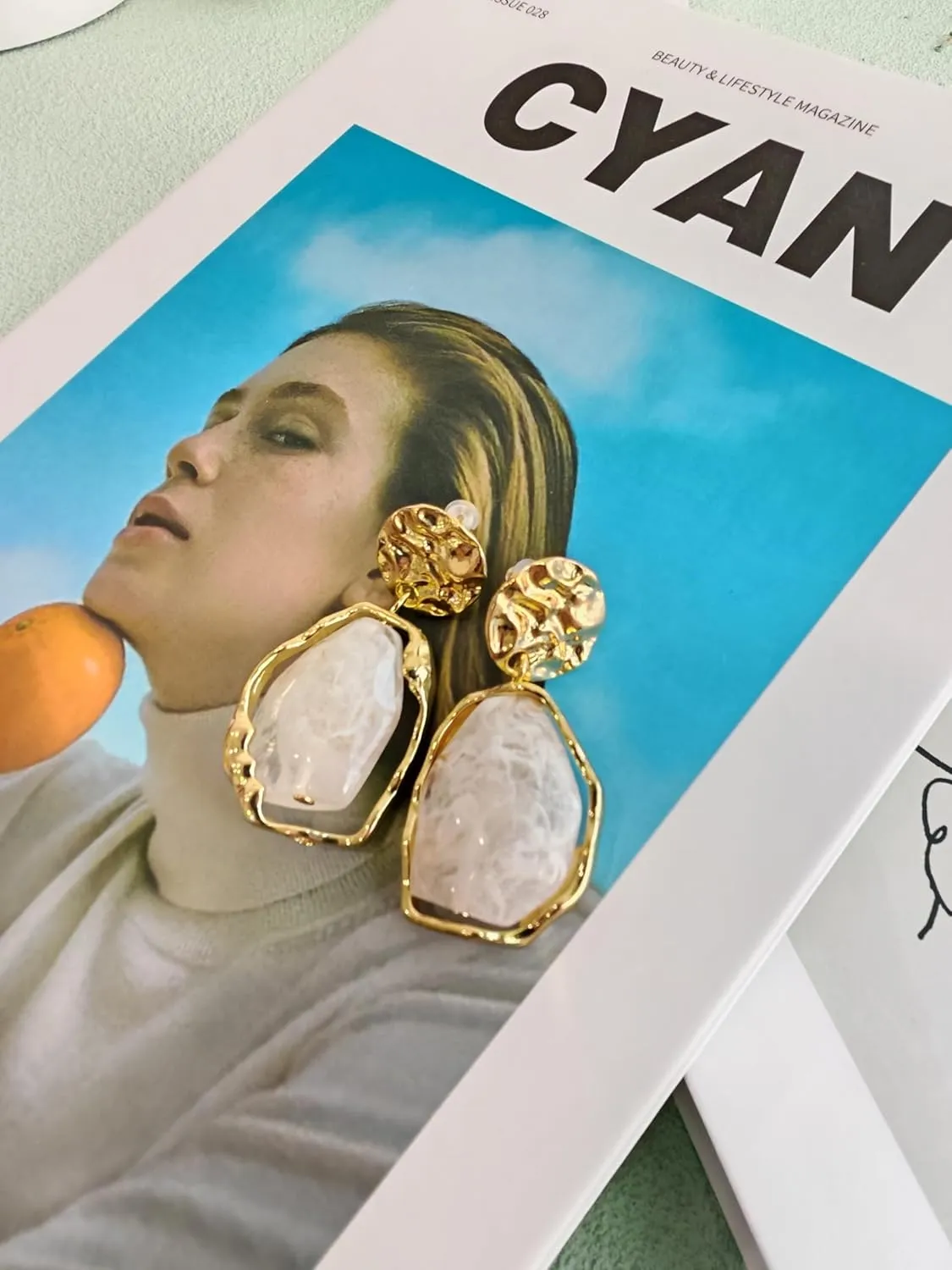 - DESIGN: Elegant drop earrings featuring textured gold-tone tops and large translucent stone pendants in irregular geometric shapes
