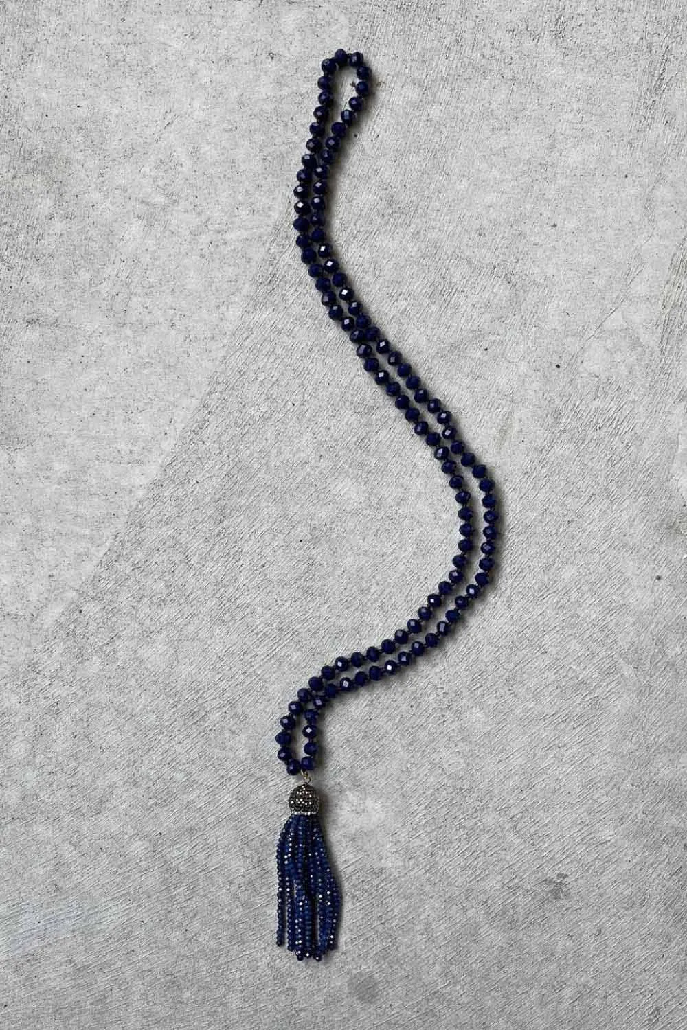 A fun and unique accessory to your outfit, the crystal tassel necklace is a statement that’s sure to stun. Whether adding a pop of fun at brunch, or dressing up your evening outfit, this navy necklace is a versatile must-have.