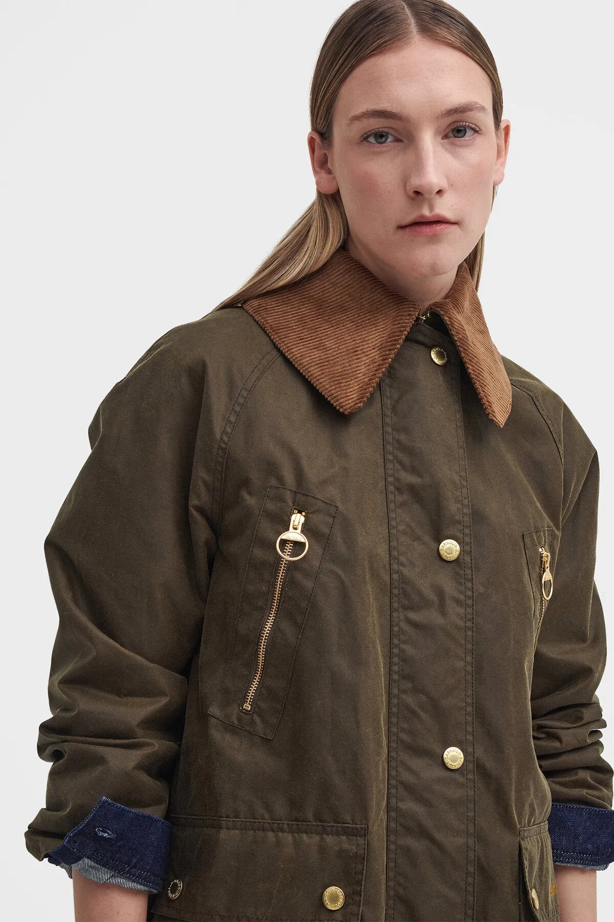 Inspired by our classic archive designs, the Barbour Ebberston Waxed Jacket offers a seamless blend of tradition and modernity. Crafted from our signature waxed cotton for classic look while an oversized rendition of our signature cord collar and back vent give it a contemporary touch. Finished with bright gold-tone detailing to the studs and zips, why not try turning back the cuffs to reveal our classic tartan too?
