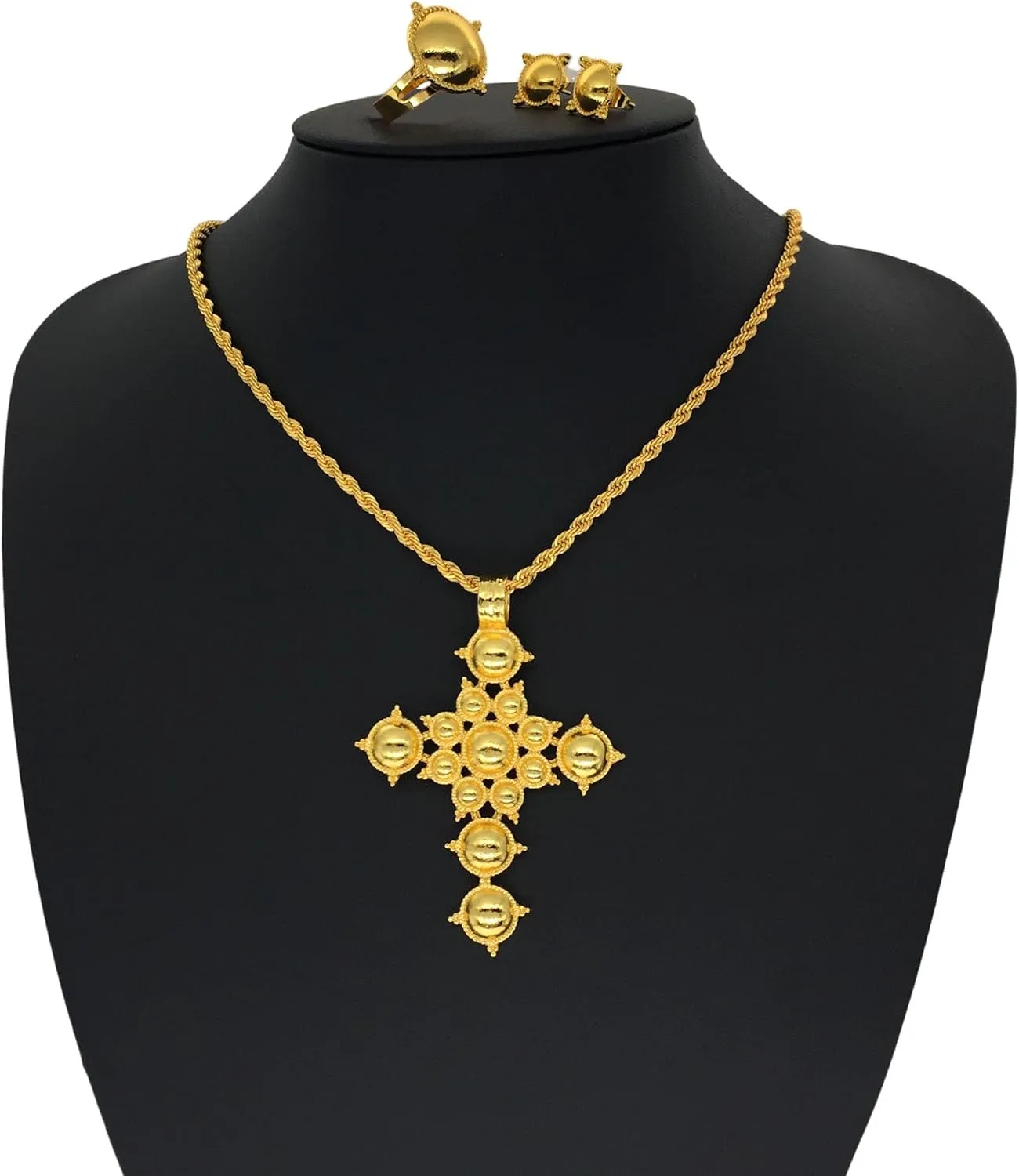 - Elegant Ethiopian Gold Jewelry Set: Elevate your style with our exquisite jewelry set, featuring a necklace with length 17.7 Inches (45cm), earrings, and adjustable ring for a perfect fit