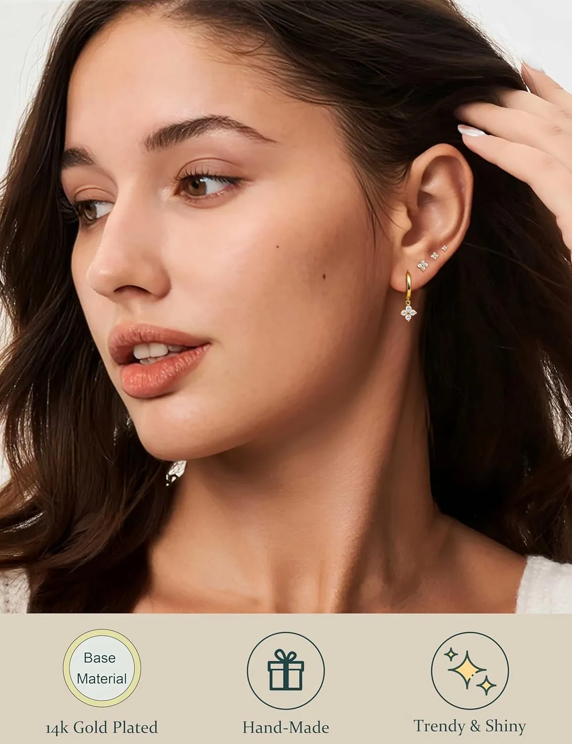 - Gold Stud & Huggie Hoop Set:Includes 3 pairs of gold Leaf Rhombus Round stud earrings in mini (3 mm / 0.12 in), tiny (4 mm / 0.16 in), and small (5 mm / 0.20 in) sizes with 0.8 mm (20G) postsperfect for a chic, minimalist look or layered ear stacks. The Gold huggie hoop earrings feature a 10 mm inner diameter and 9 mm pendant width, crafted for a lightweight and secure fit ideal for everyday wear