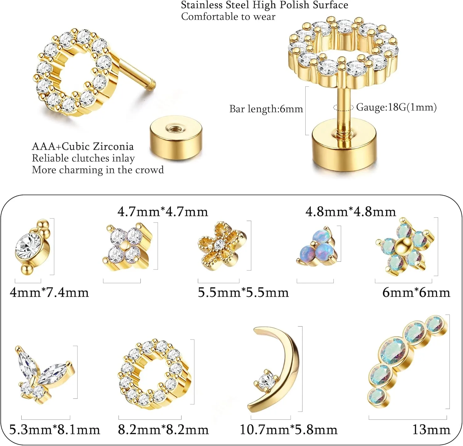 - AFFORDABLE PIERCING SET:One order includes 7 different styles of flat back cartilage stud earrings, Butterfly Earrings,Moon Earrings ,Climber Stud Earrings,Flower Tragus Earrings, Colorful CZ Stud Earrings,trio stud earrings,and Round Cartilage Earrings.choose these silver/ gold/ rose gold/ black 16g cartilage earrings to match various occasions.Minimalist look that fit your multiple piercings perfectly.Economical earring set for women.