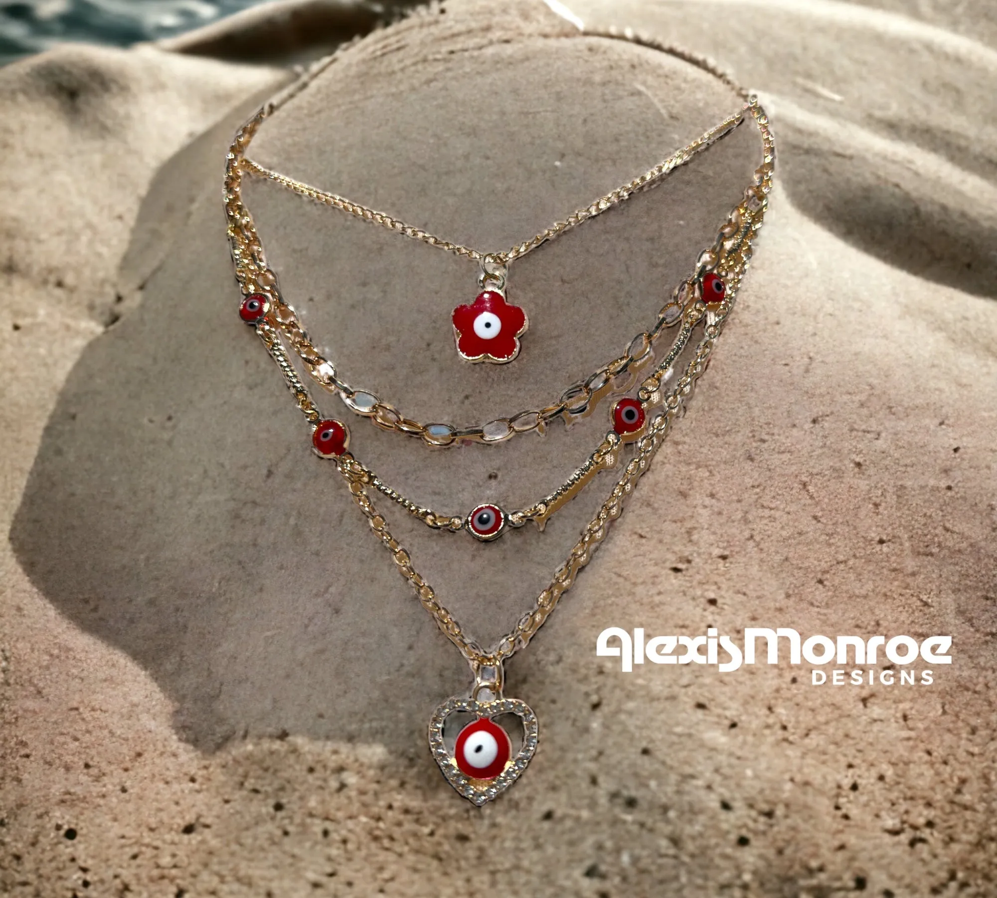 3rd Chain has a beautiful heart pendant full of tiny Rhinestones with evil eye dangle pendant.