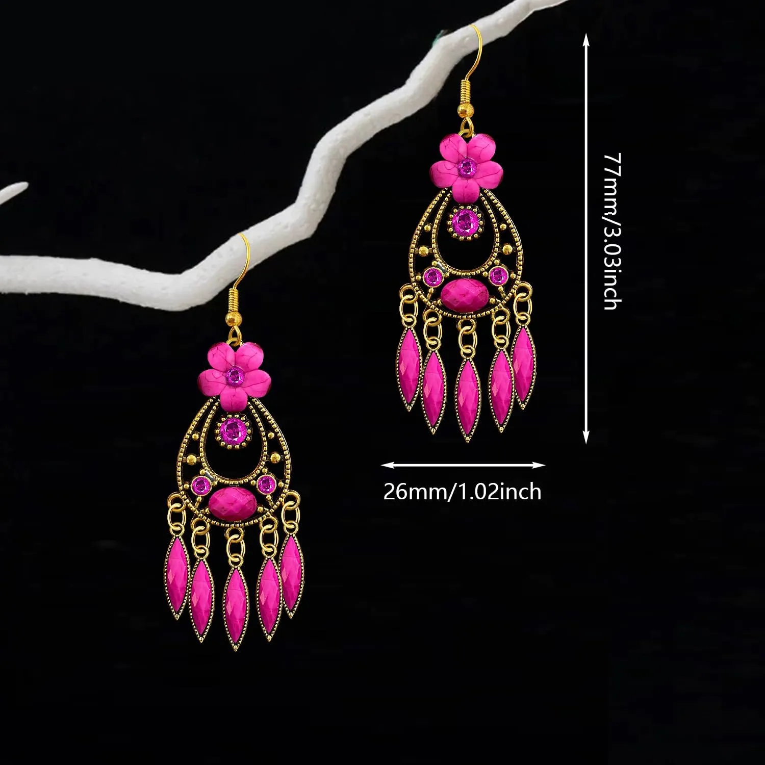 - Product Details: The earrings showcase a captivating design with a floral motif at the top, leading to a circular frame adorned with black gemstones and gold-tone accents. The frame is connected to a series of black, teardrop-shaped pendants that dangle, adding movement and a touch of personality to the overall look