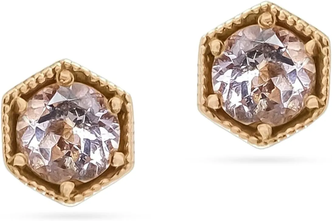 Add a touch of vintage elegance to your jewelry collection with these stunning hexagonal stud earrings. The delicate pink crystal stones are beautifully showcased in an intricate hexagonal setting, creating a perfect blend of classic and contemporary style. The 14K gold plated finish adds a luxurious warmth while maintaining durability for everyday wear. Each earring features detailed milgrain edging around the hexagonal frame, highlighting the sophisticated craftsmanship. The secure butterfly backs ensure comfortable, worry-free wear throughout your day. These versatile studs are perfectly sized to make a subtle yet striking statement, whether paired with your professional attire or adding sparkle to your evening ensemble. The romantic pink hue of the crystals catches and reflects light beautifully, creating a soft, feminine glow that complements any skin tone. These timeless pieces work equally well as your signature everyday accessories or as special occasion jewelry.