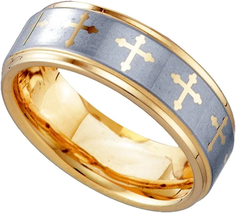 Two tone Brushed Center Irish Claddagh Celtic Trinity Knot Religious Faith Cross Step Edge Mens Comfort-Fit 8mm Wedding Anniver In-Tungsten