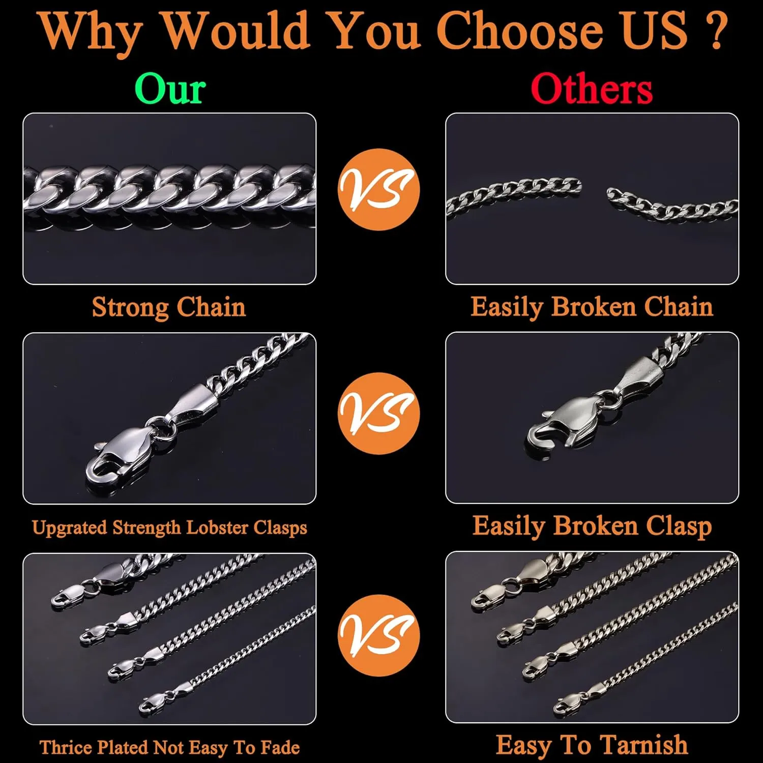 - SKIN FRIENFLY MATERIAL: The chain necklace is made of 316L stainless steel, the chain comes with a easy-to-clasp lobster claw clasp is super durable and sturdy; the necklace has long-lasting color retention and wear resistance. Non-fading and hypoallergenic, friendly to sensitive skin. Unlike sterling silver chain, stainless steel chain necklace for men is the best choice for daily wear, indoor(showering) or outdoor sports(swimming, sweat), because of its excellent maintenance characteristics, such as heat-resistant, water-proof.