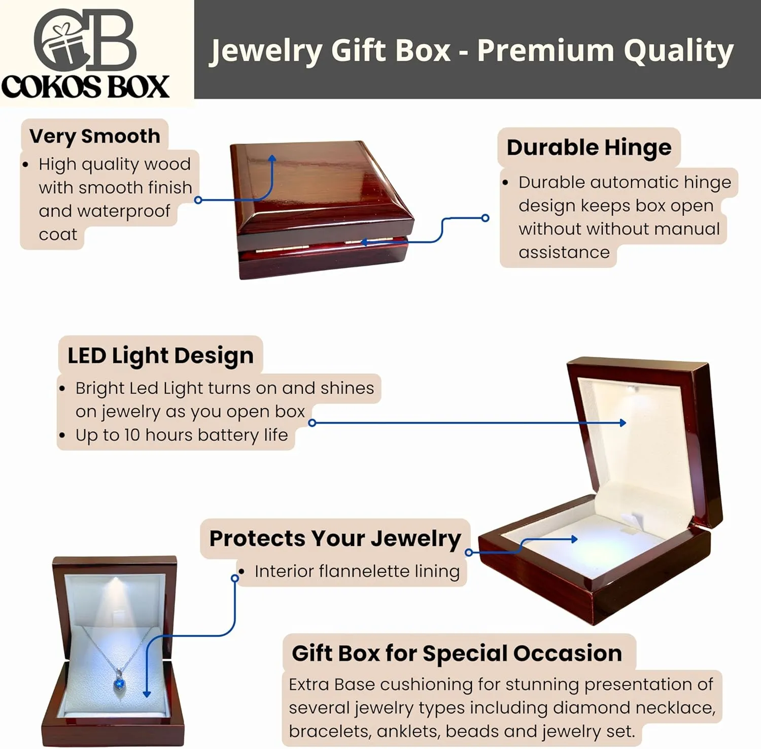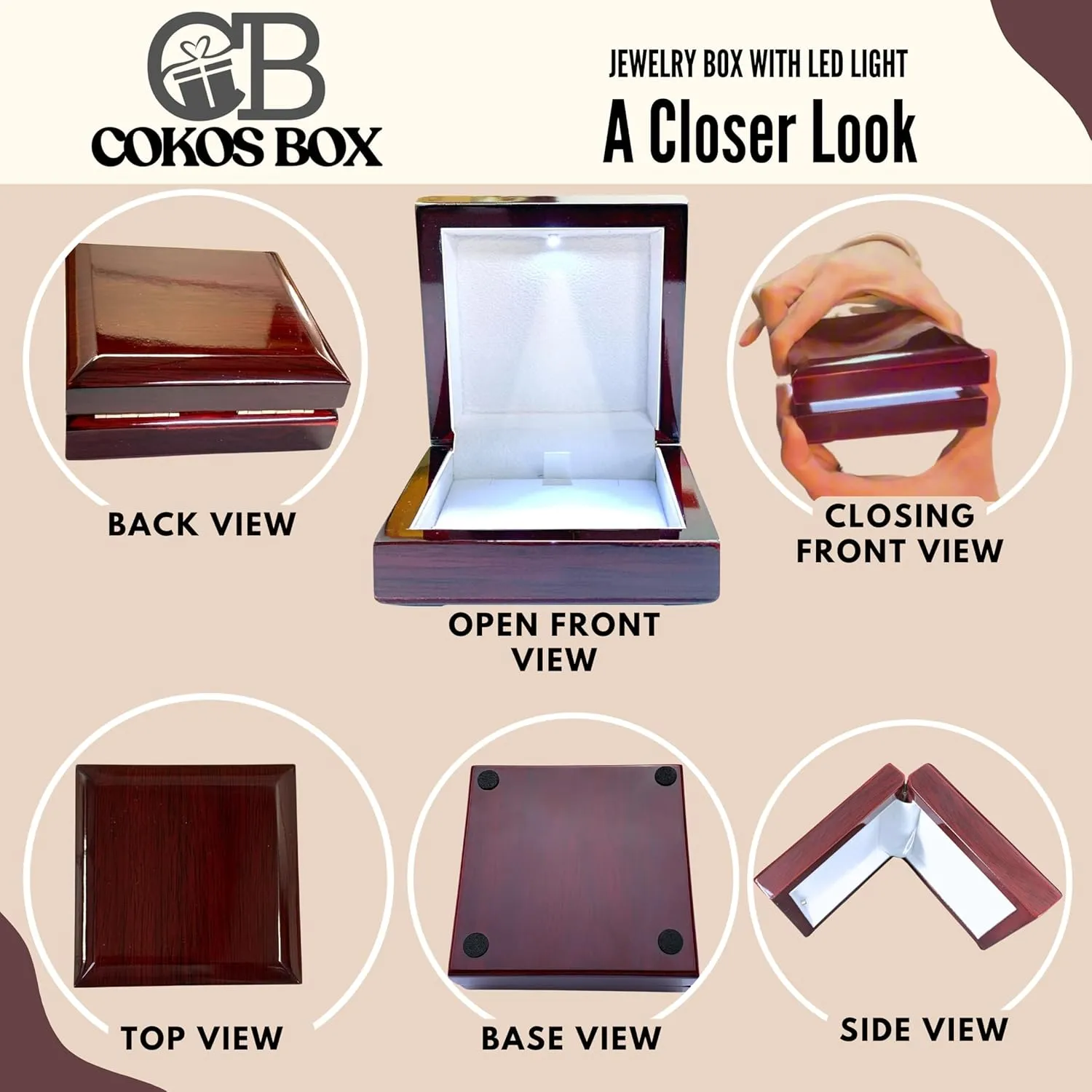 - LUXURY WOOD MATERIAL: Crafted from durable wood with a high-gloss mahogany-style finish, the Cokos Box jewelry case offers both luxury and protection. Inside features a soft velvet-like flannelette fabric lining to protect necklaces, chains, or bracelets from scratches. The durable hinges allow for a smooth open-close motionstaying open for a stunning jewelry display. A built-in LED light automatically turns on when the box is opened, casting a warm glow on your treasured piece.