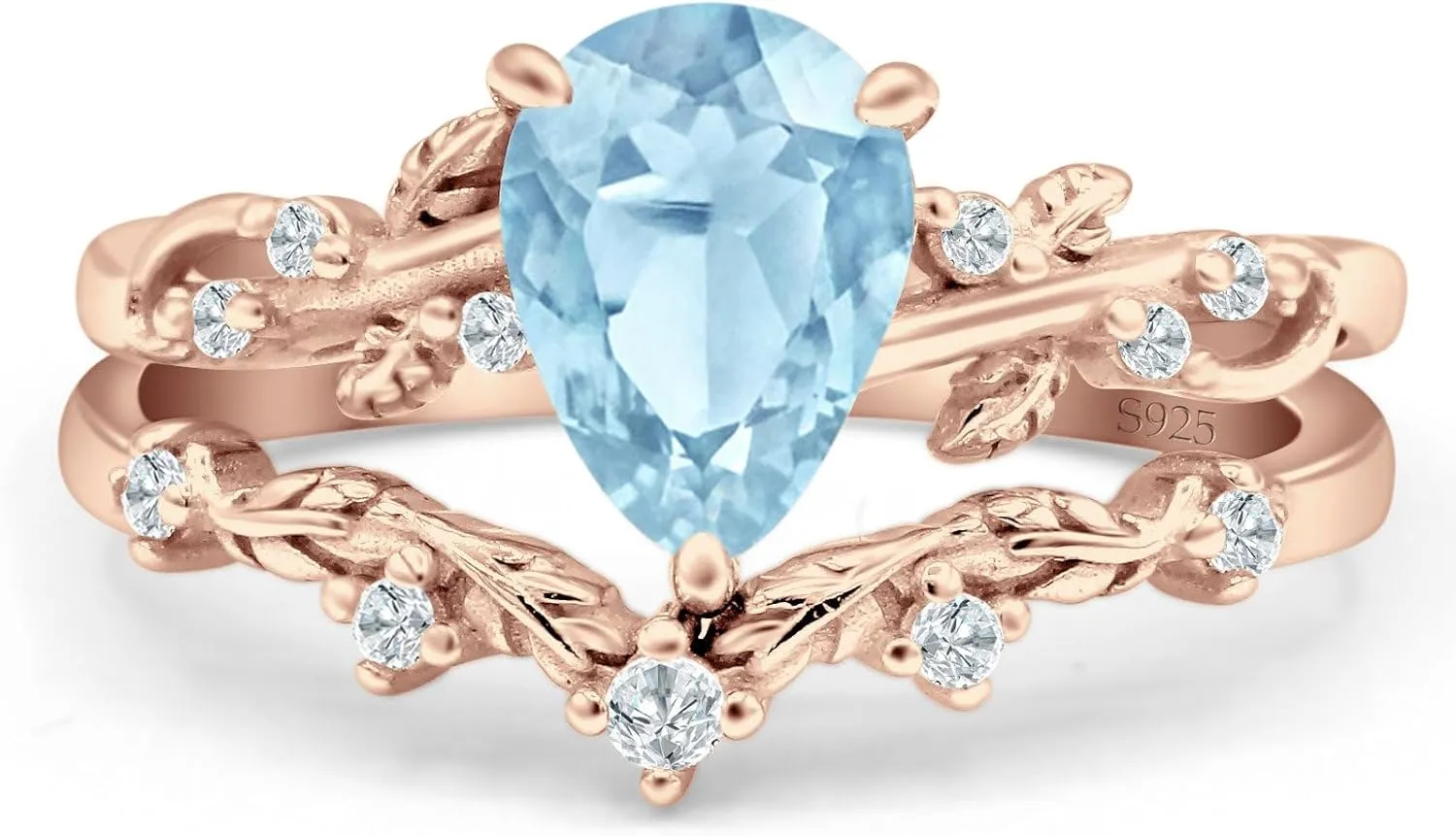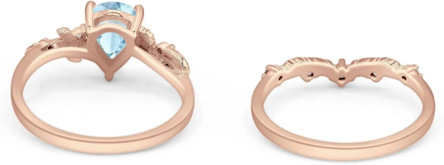 OMRANII Two Piece Art Deco Pear Teardrop Cubic Zirconia Curved Contour Band Chevron Ring Leaf Style Wedding Set Engagement Rings 925 Sterling Silver Birthday Gift For Women