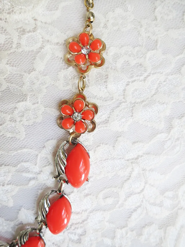 This is so much fun in the sun! You will love this pop of color to wear all season long. The enamel flower is a brooch from the 1960's and is mounted onto a box clasp. The 2 smaller flowers were lovely little drops from vintage screw back earrings. Fabulous Thermoset necklace links finish off this piece, together with a pretty silver and gold link chain. There is also a lobster clasp with a 4" extension chain, adding to the over all length of 22".