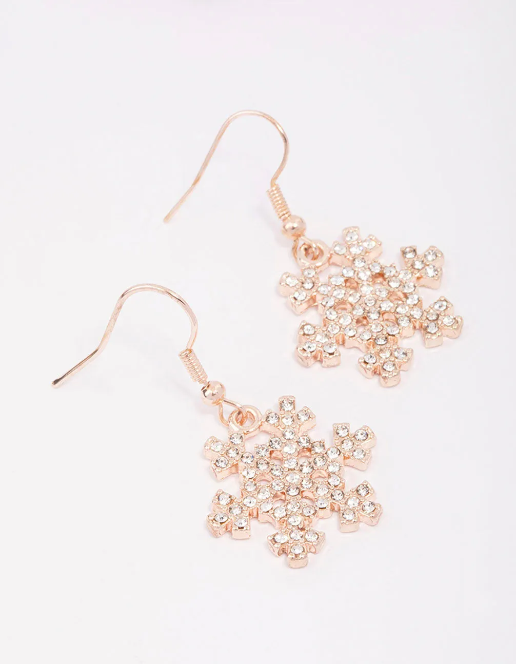 - These rose gold drop earrings feature intricate, glittery snowflakes for a winter wonderland inspired look.