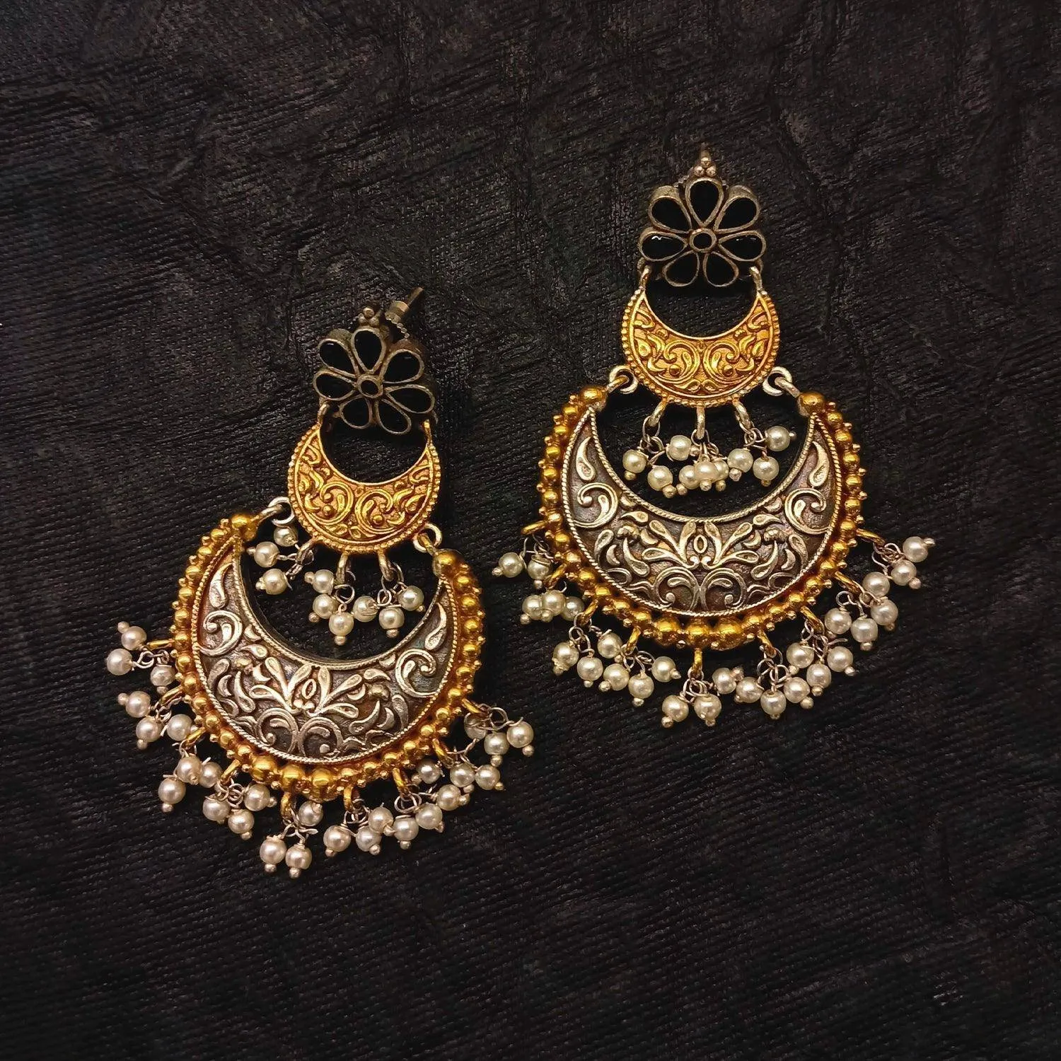 Immerse yourself in the timeless beauty and intricate craftsmanship of these exquisite pieces. Their unique golden and silver tones capture the essence of cultural richness while adding a modern twist. Ideal for those who appreciate the finer details, these earrings are more than just an accessory—they are a statement of grace and confidence.