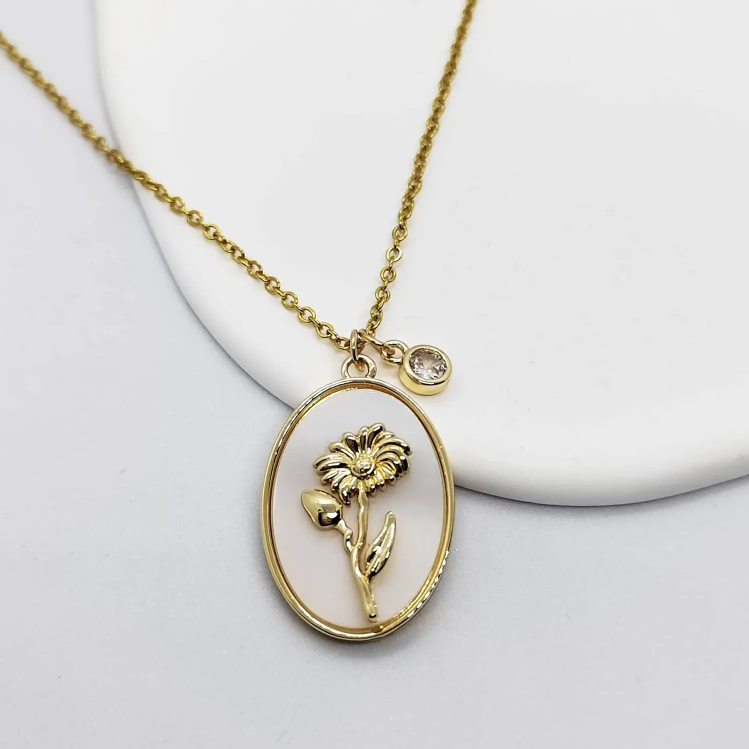 - PendantCute Oval style Pendant with Stereoscopic Birth Flower flora embossed, very delicate and classic pendant for women. This kind of minimalist coin necklace is a hit, Inlaid white shell in fashion and all match with your daily outfit. With meaningful flower hidden message, the disc necklace will deliver your love and blessing.