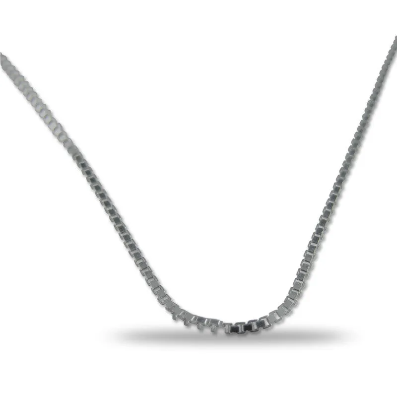 This sterling silver Box Chain is made in Italy and is .8 mm wide and 16 inches or over 40 centimeters long. This fairly light chain works well with our oval and teardrop shaped sterling silver pendants by Richard Krentz. We recommend the 1.2 mm wide silver chains for most other pendants that we offer.