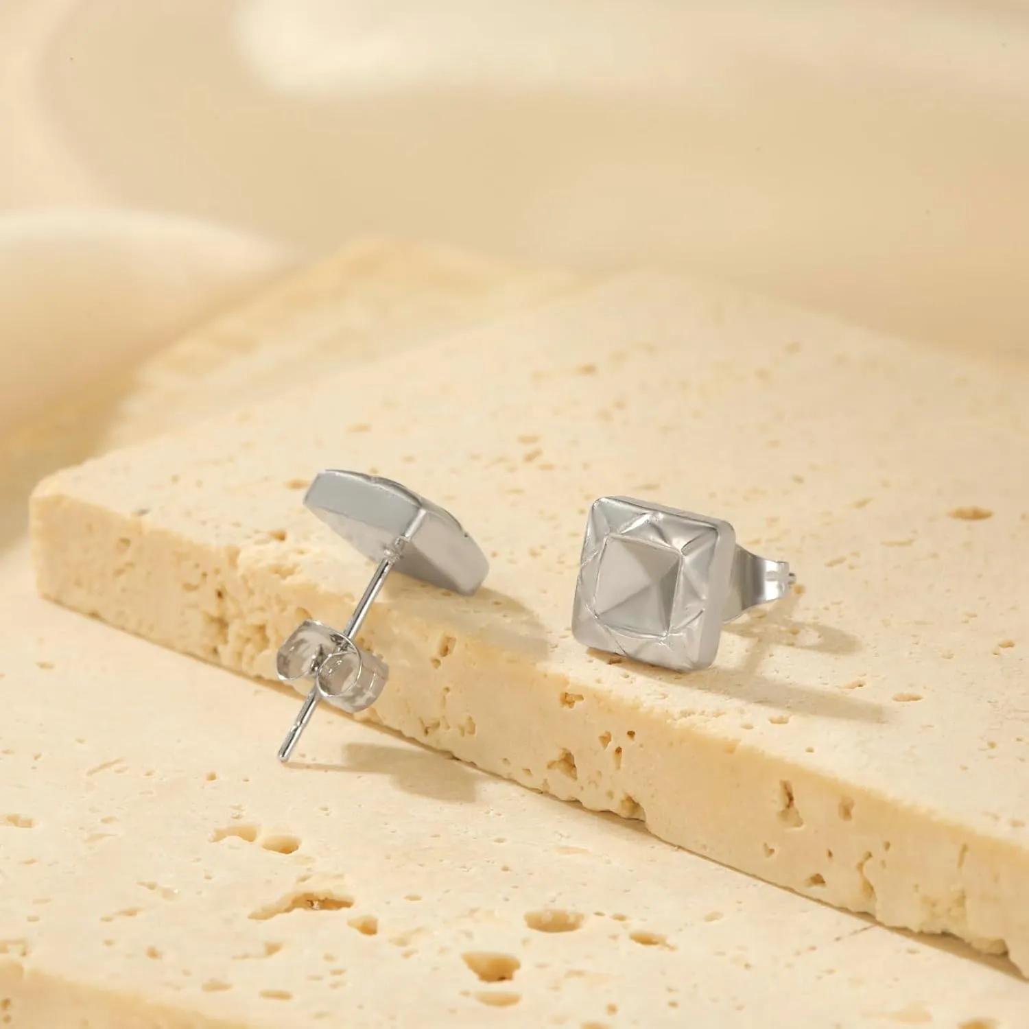 - GEOMETRIC FACETED STUDS: Features square stud earrings with a unique faceted top surface, creating a subtle yet distinct geometric texture.